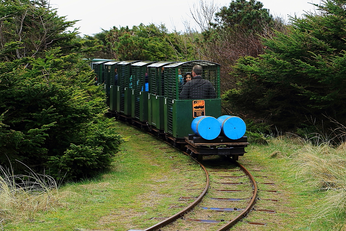 Nachdem der Zug der Museumsbahn Hanstholm am 17.04.2014 den Geschützbunker verlassen hat, ist er jetzt wieder unterwegs zu seinem kleinen Bahnhof.
