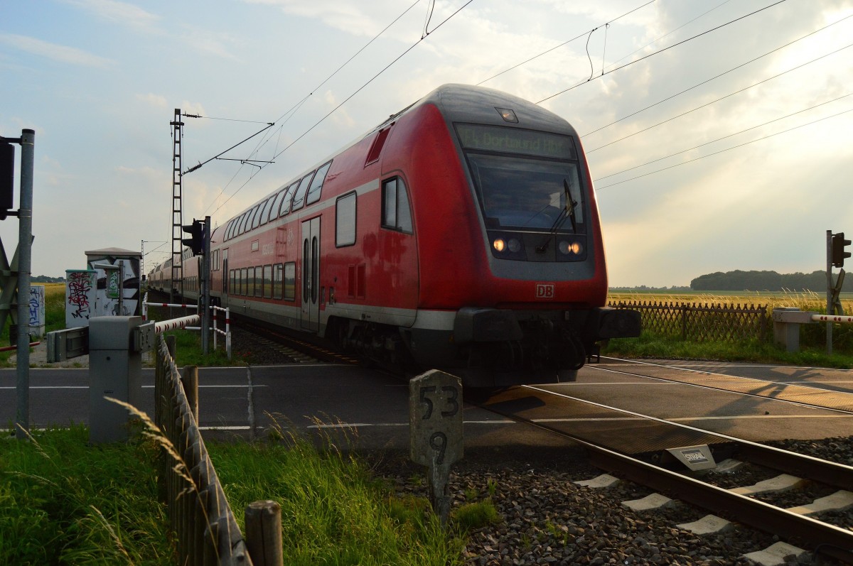 Gegenlichtbild eines RE4 Zuges am Bü Am Chur/In der Schley bei Wickrathhahn. 24.6.2014