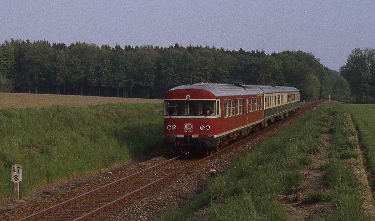 "Haller Willem" am 18.5.1982. 624668 hat gerade den Haltepunkt Osnabrück - Sutthausen verlassen und ist um 18.05 Uhr in Osnabrück - Hörne in Richtung OS-HBF unterwegs.