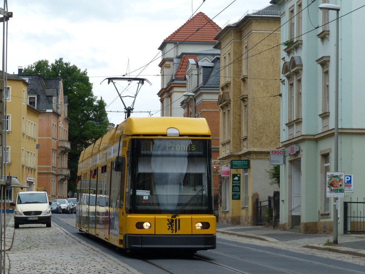 In der Warthaer Straße erreicht Linie 1 nach Prohlis die Station Cossebauder Straße. 29.6.2014