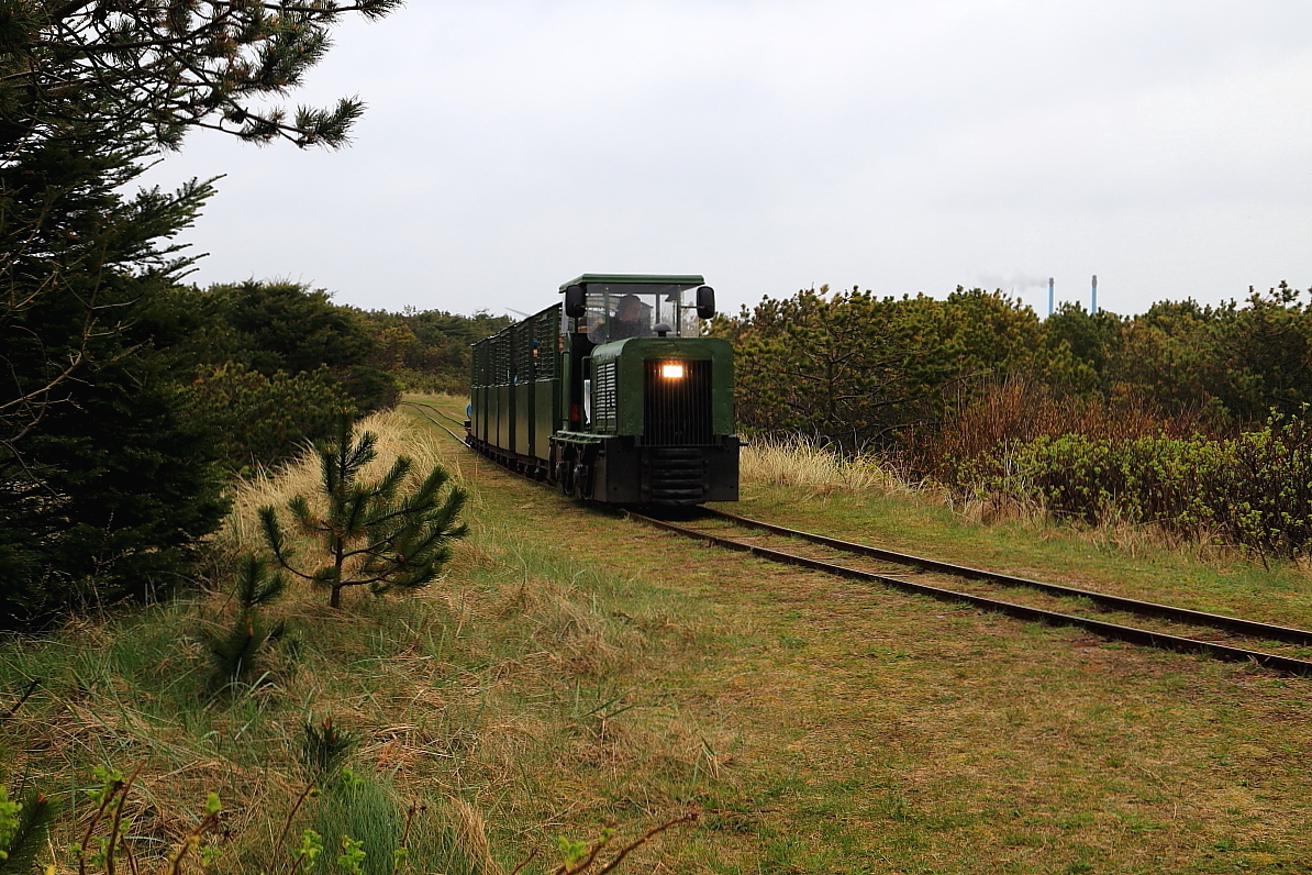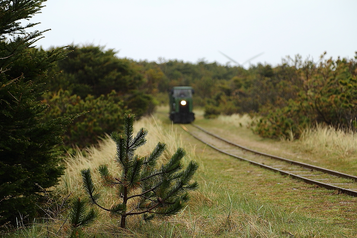 Der Zug der Museumsbahn Hanstholm taucht hier, am Mittag des 17.04.2014, gerade, mit Fahrtrichtung Bahnhof, in den dichten Hanstholmer "Küstenurwald" ein.