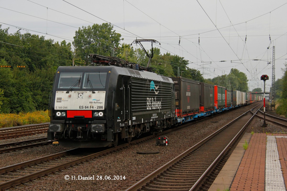 MRCE 189-286 ERS Railways mit einem KLV Auflieger am 28.06.2014 in Dormagen.