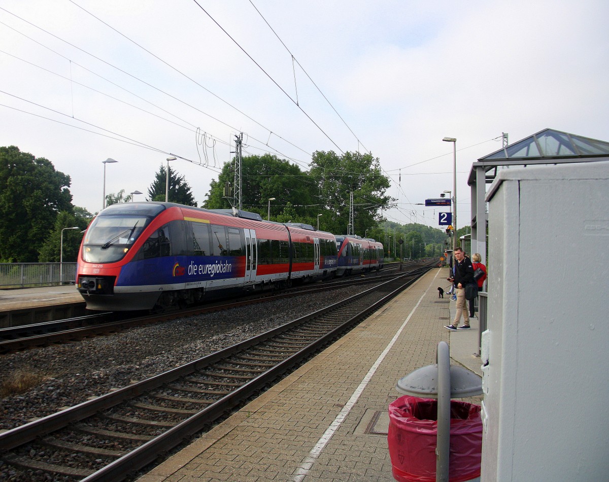 Zwei Euregiobahn (RB20) kommt aus Langerwehe-Stolberg-Altstadt nach Heerlen(NL) aus Richtung Aachen-West,Laurensberg,Richterich und hält in Kohlscheid und fährt in Richtung Herzogenrath. Bei Wolken am Morgen vom 18.6.2014.