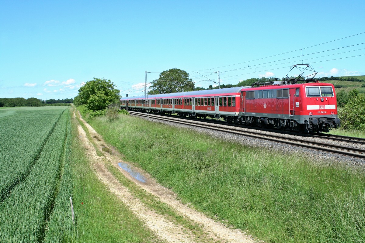 111 062-6 mit der RB 26566 von Neuenburg (Baden) nach Offenburg am Nachmittag des 23.05.14 nördlich von Hügelheim.