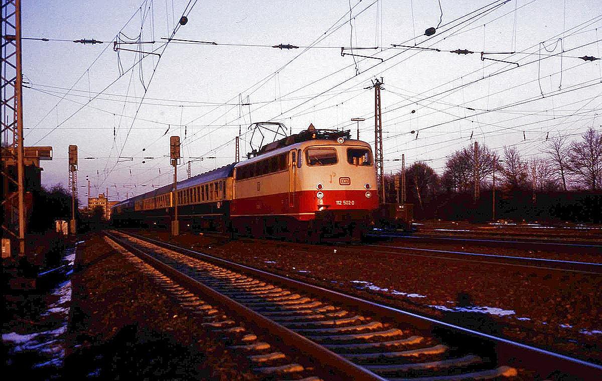 112502 ist in der Abendsonne des 23.2.1987 um 17.13 Uhr in Höhe Stellwerk Osnabrück Hörne mit einem D in Richtung Münster unterwegs.