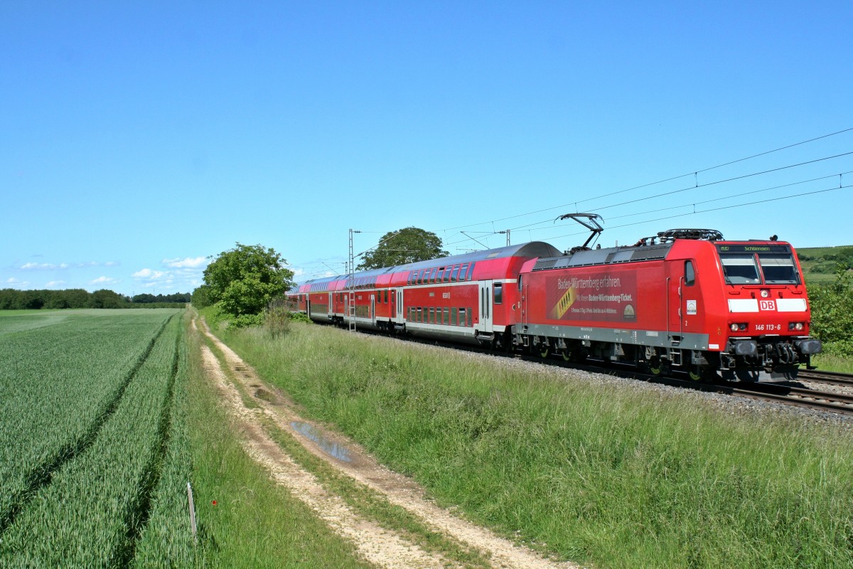 146 113-6 mit einem RE von Offenburg nach Schliengen am Nachmittag des 23.05.14 bei Hügelheim.