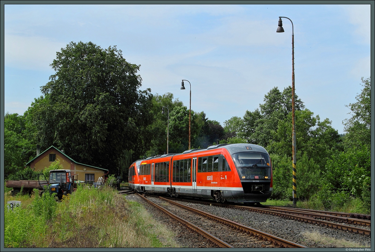 642 038 erreicht am 05.07.2014 den Bahnhof Šluknov. Mit der Wiedereröffnung der Strecke Sebnitz (D) - Dolní Poustevna (CZ) wurde die Regionalbahnlinie U 28 neu eingerichtet, welche von Děčín über Bad Schandau, Sebnitz und Dolní Poustevna nach Rumburk führt. Aufgrund der großen Nachfrage wurden die Fahrten zur Eröffnung der Strecke mit einem weiteren Triebwagen verstärkt.