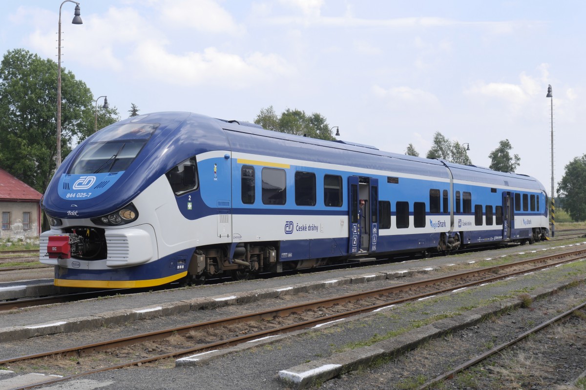 Die tschechische BR 854 (im Bild vom 8.7.14: 854 218-5 im Bahnhof Rybniste) ist ein Umbau aus zwei älteren Baureihen. Im grenznahen Bereich zwischen Rumburk und Decin wird sie wohl bald von den PESA-"Haien" verdrängt werden.