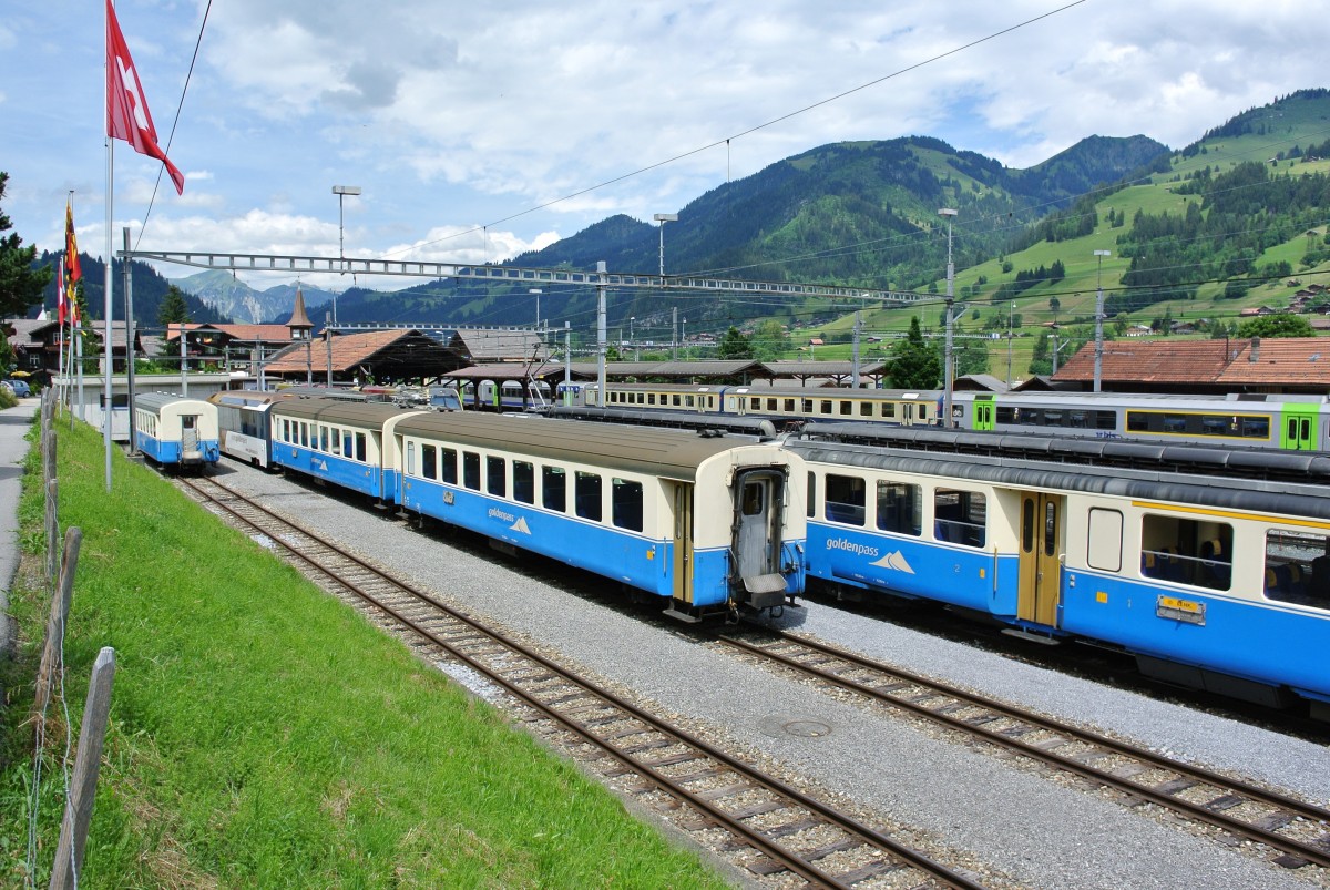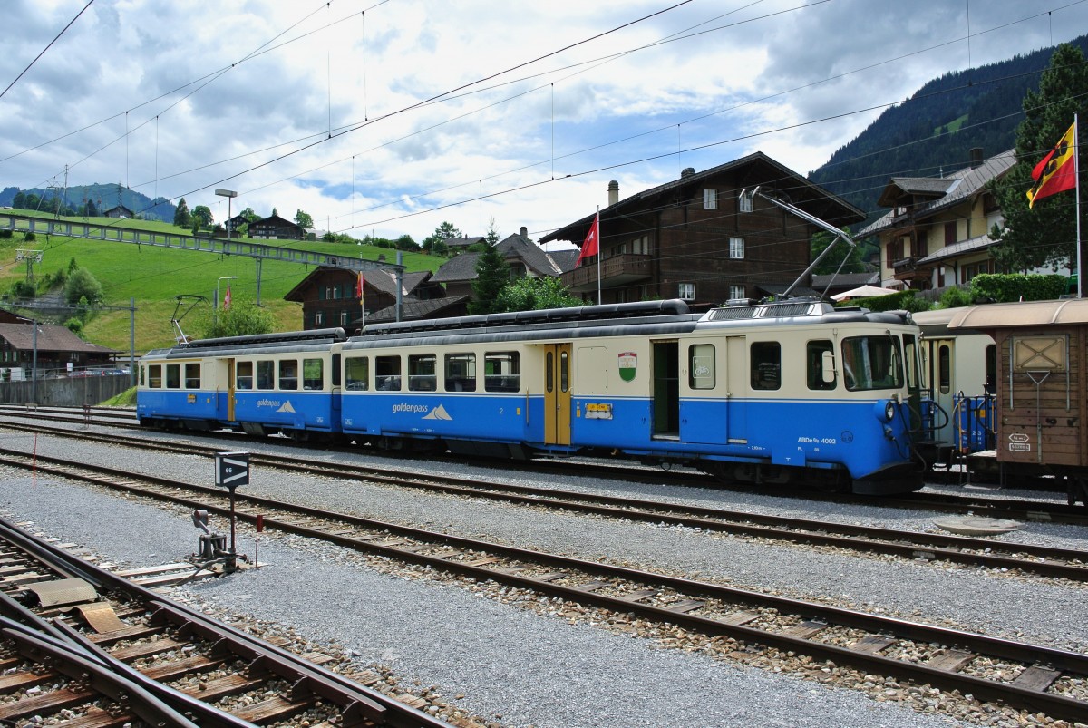 MOB GDe 4/4 6005 mit Ars 101, As 102 und Ast 117 als Train de Chocolat in Bulle, 01.07.2014.