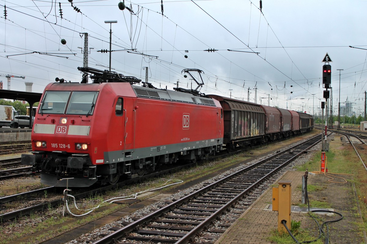 Am 02.05.2014 durchfuhr die 185 128-6 von DB Schenker den Bahnhof von Basel Bad mit einem gemischten Güterzug über Gleis 1.