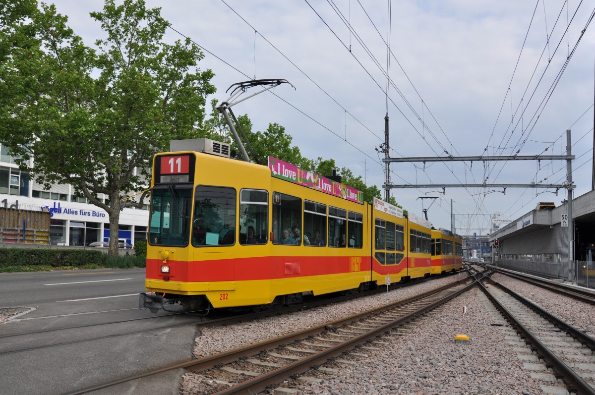 Be 4/8 202 zusammen mit dem Be 4/6 260 fahren auf der Linie 11 Richtung Haltestelle Ruchfeld. Die Aufnahme stammt vom 17.06.2014.