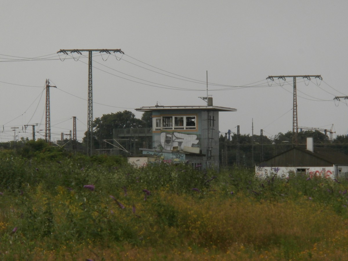Blick auf ein altes Stellwerk. Das Stellwerk hatte einst die Aufgabe die Weichen und Signale in und um den Bahnhof zu stellen. Vermutlich war es auch für den Güterbahnhof. Heute ist nur noch ein Stellwerk für den Hauptbahnhof in Betrieb. Damals waren 2 Stellwerke für den Güterbahnhof. 1 war am Anfang des Gleisfeldes fast unter der Autobahnbrücke. Nummer 2 ist mitten im Gleisfeld positioniert gewesen. Heute sind beide von Vandalismus heimgesucht worden und beschmiert worden.