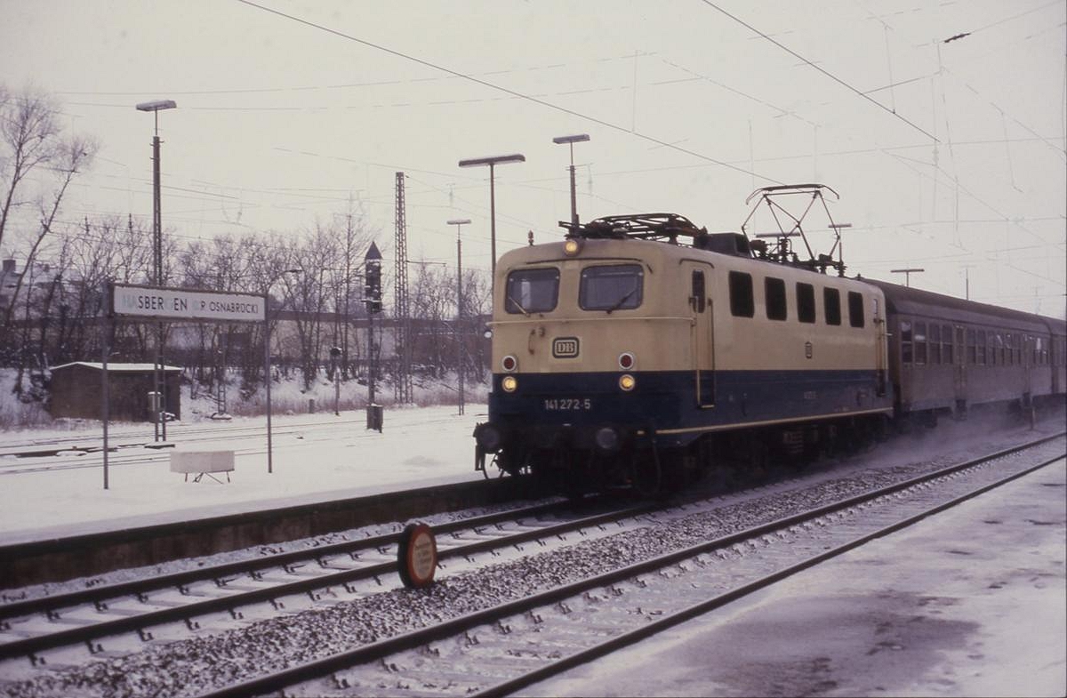 Das Bahnhofschild Hasbergen ist nicht mehr ganz zu lesen, während 141272 mit dem Nahverkehrszug aus Münster am 12.1.1987 um 14.06 Uhr auf Gleis 3 einfährt. Im Hintergrund sieht man noch ein Relikt aus dem zweiten Weltkrieg. Der kleine Bunker diente einst Lok- und Rangierpersonal als "sicherer" Unterstand bei Luftangriffen.