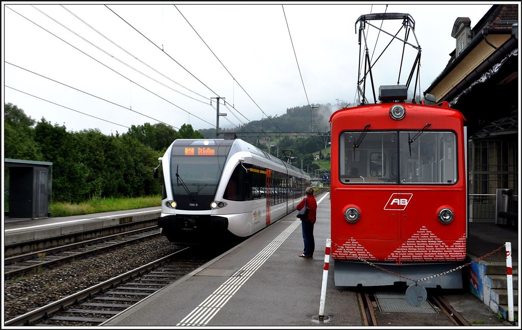 Der frisch revidierte Triebwagen der Rheineck Walzenhausen Bahn bewog mich mal einen andern Weg von Heiden nach Chur zu fahren. S2 23260 RABe 526 796-8 nach Herisau hält unmittelbar neben dem BDeh 1/2 1 in Rheineck. (10.07.2014)