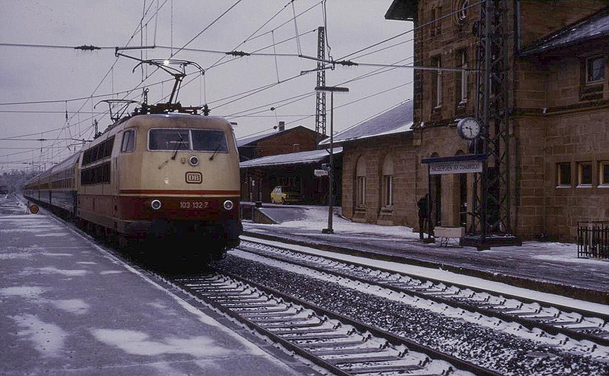 Der Himmel ist noch dunkel und hängt voll mit Schnee. Es ist der 3.3.1987 und es herrscht Chaos auf der Rollbahn. Durch Eisbruch war die Strecke nachts gesperrt. Elektrolok 103132 ist eine der ersten, die um 9.27 Uhr mit ihrem D wieder freie Fahrt in Richtung Osnabrück hat. Die Fahrleitung im Bahnhof Hasbergen ist noch stark vereist, so dass es mächtig am Stromabnehmer blitzt.