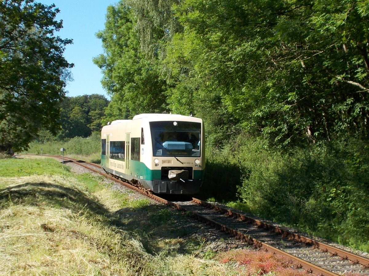 Der Stammtriebwagen PRESS VT650 032 von Lauterbach Mole nach Bergen/Rügen,am 15.Juni 2014,beim Verlassen von Putbus.