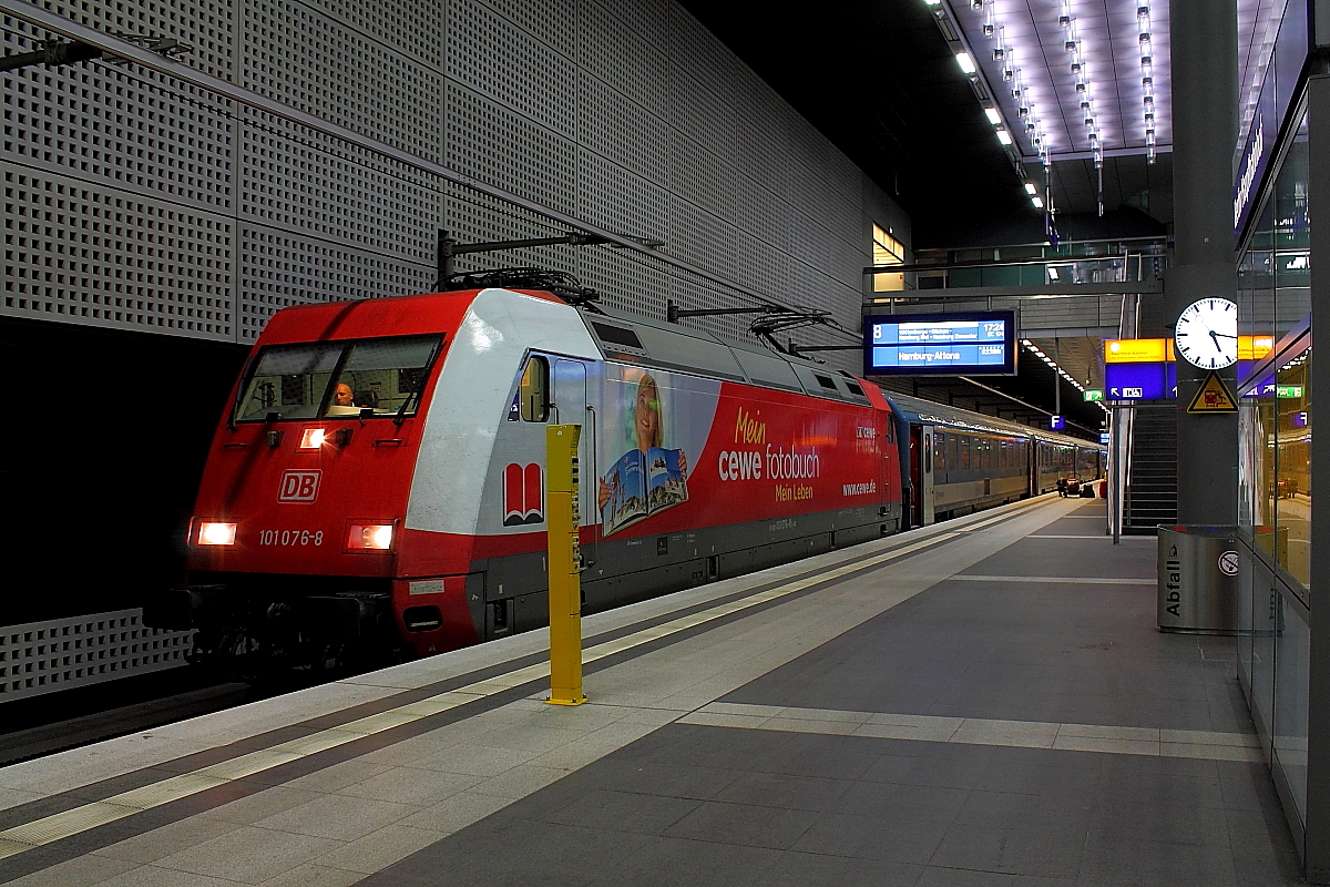 Hier 101 076-8 mit CNL1259 von Zürich HB nach Berlin Lichtenberg und IC61259 von Erfurt Hbf. nach Berlin Lichtenberg, dieser Zug stand am 28.6.2014 in Berlin Südkreuz.