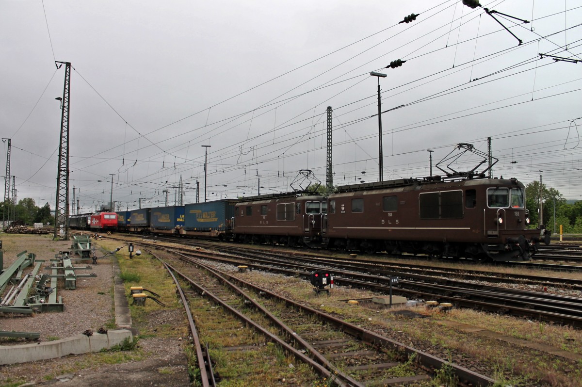 Durchfahrt am 02.05.2014 von BLS Cargo Re 425 188 "Naters" gemeinsam mit ihrer Schwester Re 425 183 "Kandersteg" und einem LKW-Walter KLV in Basel Bad Bf gen Schweiz.