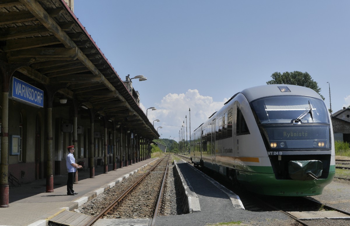 Ein stündliches Trilex-Zugpaar hat der Aufsichtsbeamte von Varnsdorf abzufertigen. Aufnahme vom 7.7.14, VT 642 324 VBG.