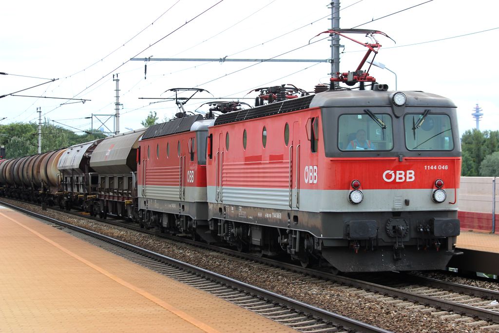 Eine Doppeltraktion von 1144ern (046+094) zieht einen Güterzug durch die Haltestelle Wien-Praterkai. 10.7.2014