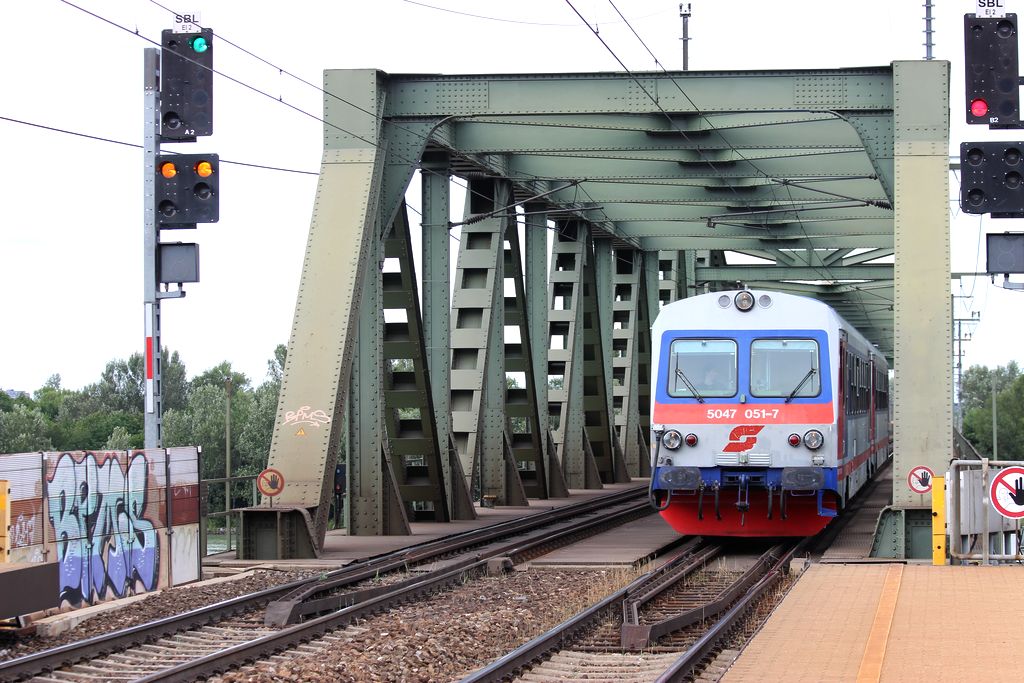 Eine Doppeltraktion von 5047 (051+054) fährt von Marchegg kommend als R in Richtung Wien Hbf in Wien-Praterkai ein. Die Ostbahnbrücke über die Donau liefert immer einen schönen Rahmen. 10.7.2014