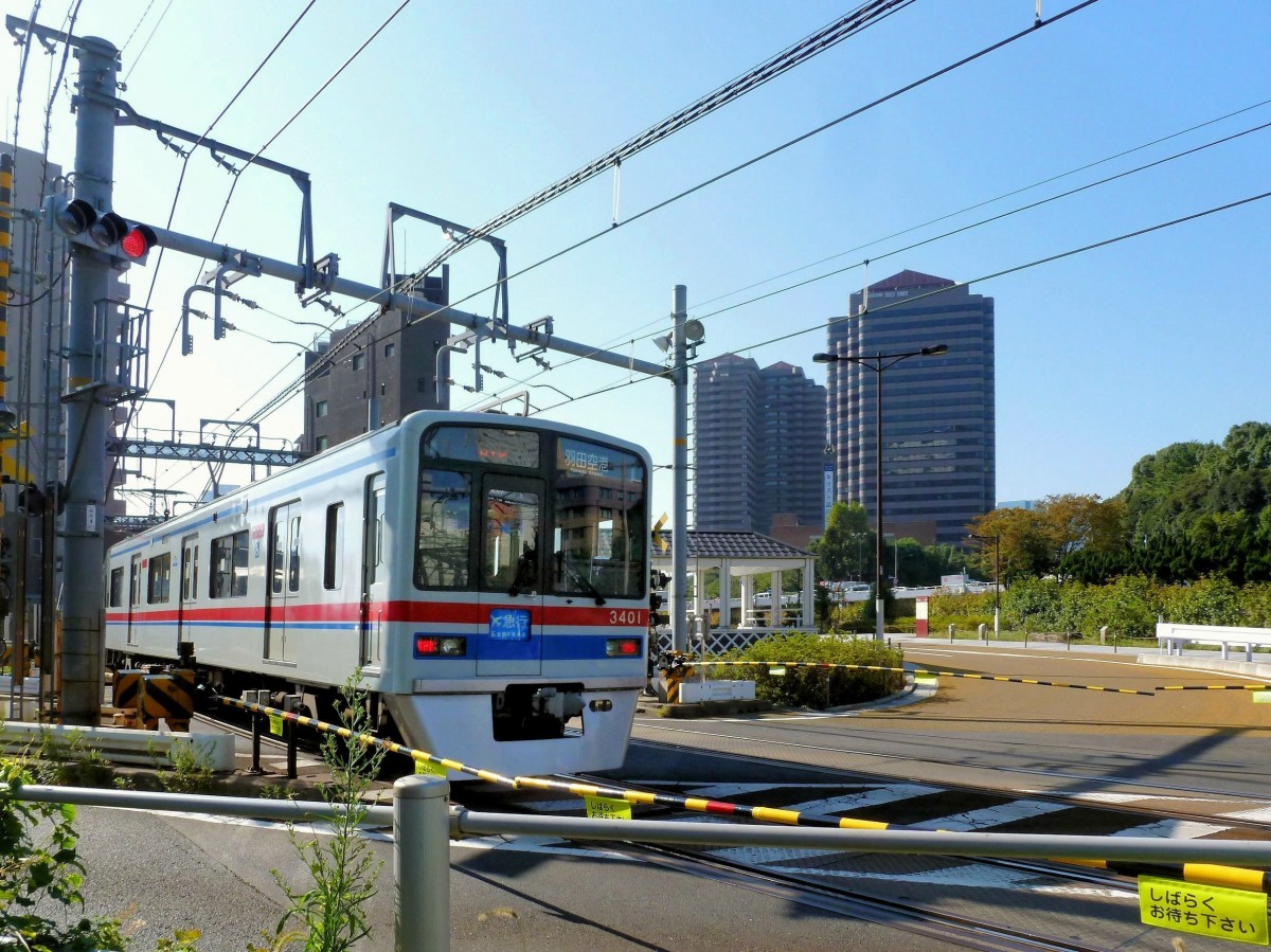 Fremde Züge auf der Keikyû-Linie: Der Keisei-Konzern. Aus dem Nordosten von Tokyo herkommend fährt Keisei-Zug 3401 (Serie 3400, 5 Züge, 1993 gebaut) über die Keikyû-Strecke zum Flughafen Haneda. Am Bahnübergang bei Kita Shinagawa, 28.Oktober 2011.