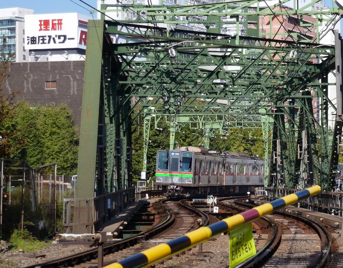 Fremde Züge auf der Keikyû-Linie: Die Chiba New Town –Bahn. Zug 9011 auf der Brücke über die JR-Geleise in Tokyo-Shinagawa. 28.Oktober 2011. Der Text am Schild an der Schranke übersetzt sich sinngemäss als "Bitte haben Sie etwas Geduld".