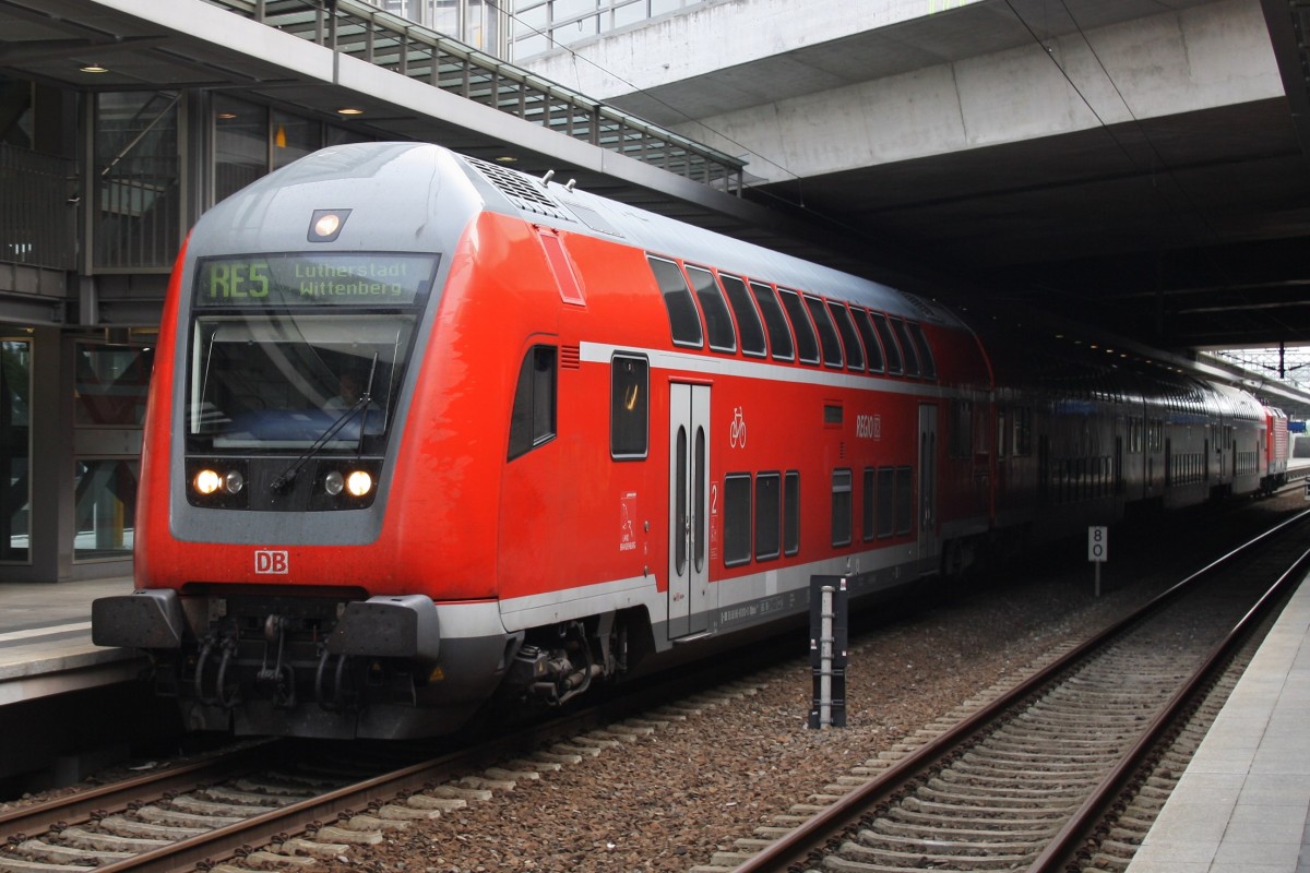 Hier ein RE5 (RE4353) von Berlin Hbf.(tief) nach Lutherstadt Wittenberg, bei der Ausfahrt am 28.6.2014 aus Berlin Südkreuz. Schublok war 112 104.
