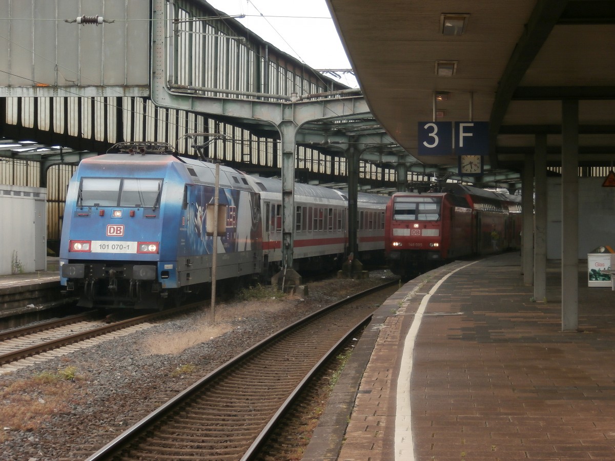 Links steht 101 070-1 von Die Adler Mannheim mit einem IC in Richtung Düsseldorf. Rechts kommt gerade 146 005 mit dem RE2 nach Düsseldorf eingefahren und gleich fahren beide fast zeitgleich ab.