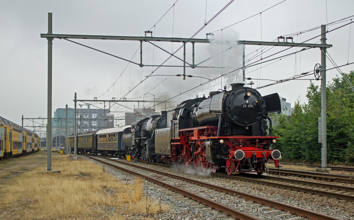 Unterwegs für die 'Stoomtreindagen op de miljoenenlijn' das ganze Wochenende in Niederländischen Limburg, Am Freitag 11-07-2014 sind VSM 23 076 und 52 3879 auf dem Weg nach dem Süden. Hier bei Bahnhof Nijmegen. 11-07-2014