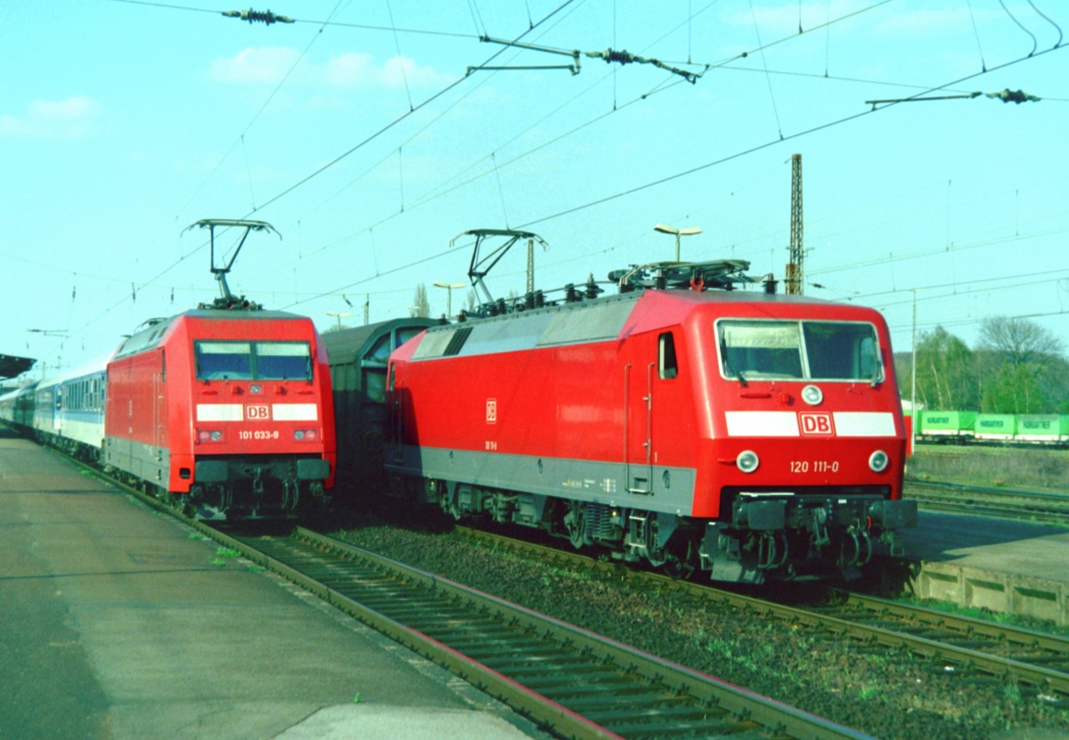 101 033 mit IR 2570 "Lüneburger Heide" (Frankfurt–Hamburg) und 120 111 mit KCL 62705 (Bremen-Sebaldsbrück–Sindelfingen) am 20.04.2000 in Elze