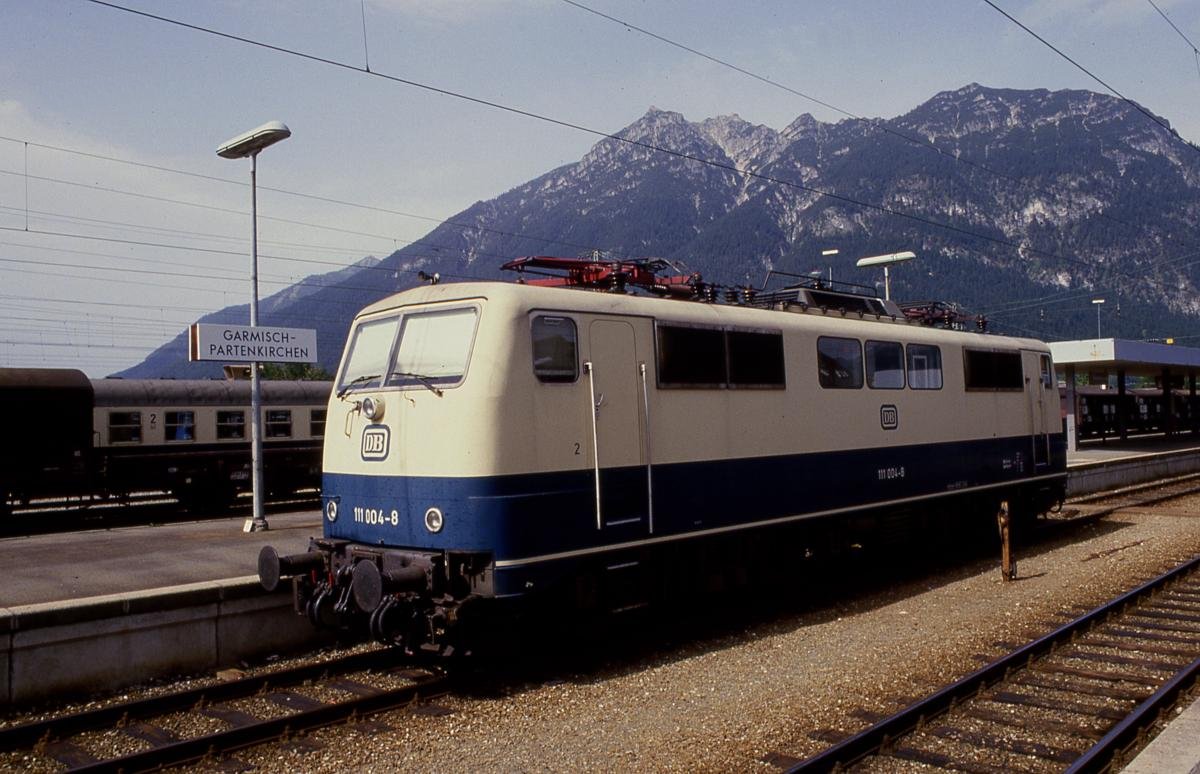 111004 am 12.3.1987 bei einer "Pause" im Bahnhof Garmisch - Partenkirchen.