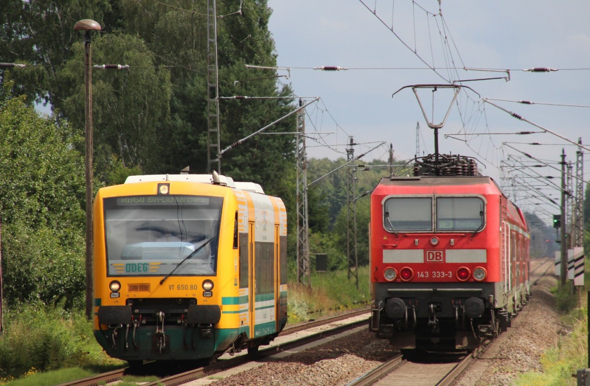 12.7.2014 Rüdnitz. ODEG nach Berlin - Lichtenberg und RE 3 nach Prenzlau mit 143-333 begegnen sich kurz vor dem BÜ in km 28.3 der Berlin-Stettiner Eisenbahn.