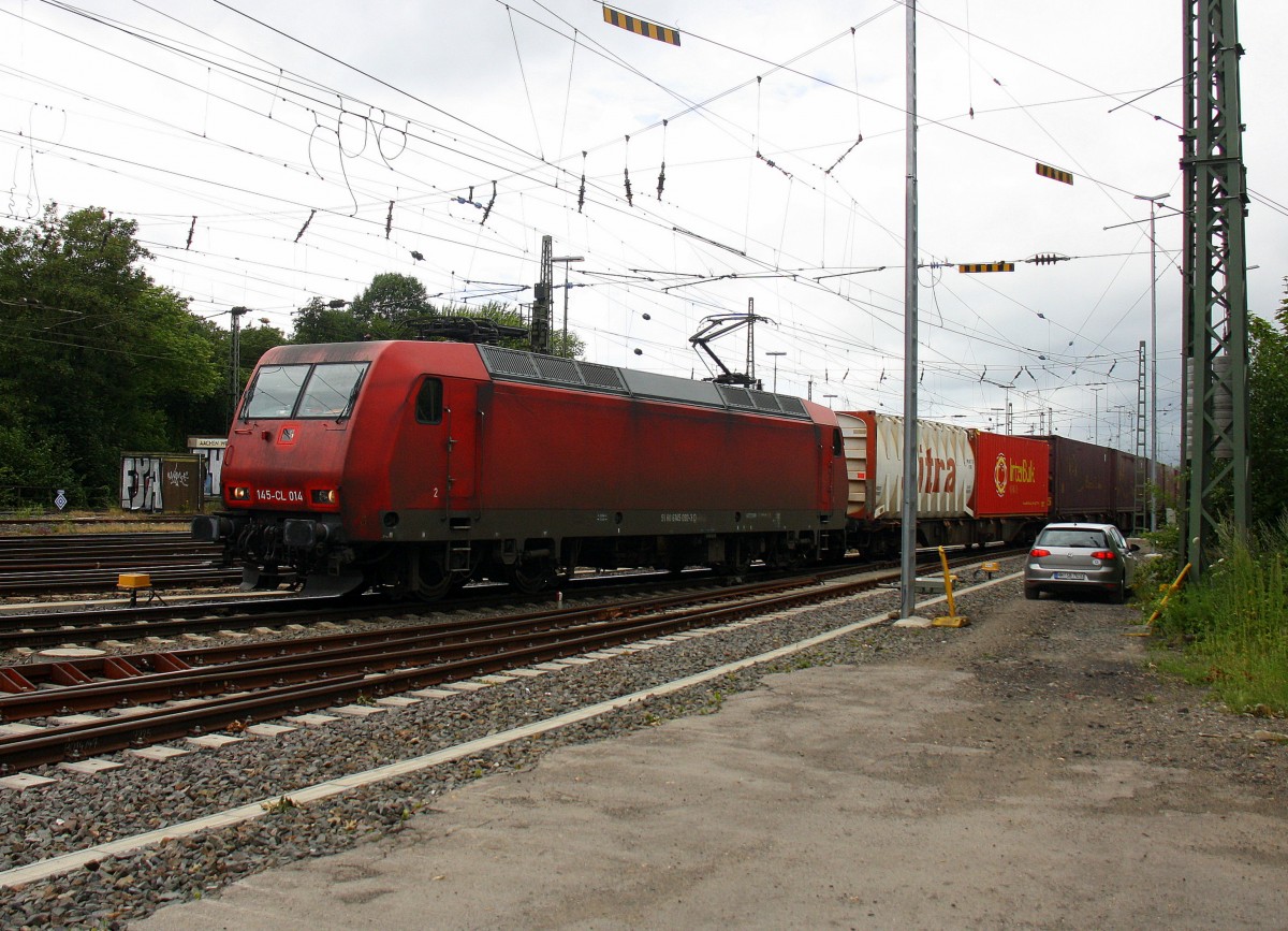 145 CL-014 von Crossrail fährt mit einem langen Containerzug aus Zeebrugge(B) nach Gallarate(I) bei der Ausfahrt aus Aachen-West und fährt in Richtung Aachen-Hbf,Köln. Bei Sonne und Wolken am Nachmittag vom 5.7.2014.