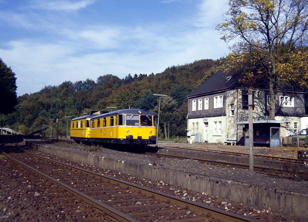 724 und 725 004 machten auf ihrer Messfahrt von Neuenrade nach Menden am 09.10.1990 in Binolen kurzen Halt.