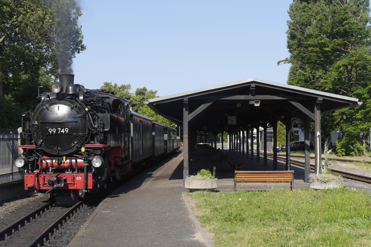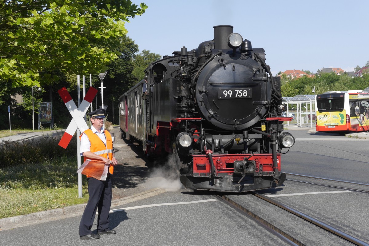 99 758 stellt ihren Zug nach Oybin bereit. Im Bild die bekannte Überquerung des Zittauer Bahnhofsvorplatzes, 7.7.14.