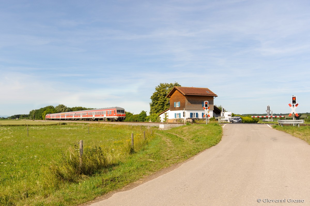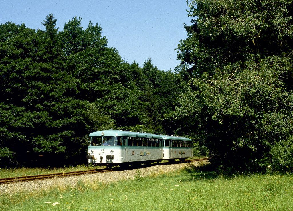 Auf der Chiemgaubahn von Prien nach Aschau waren 798 653 und 998 896 am 29.07.1988 bei Umrathshausen unterwegs.