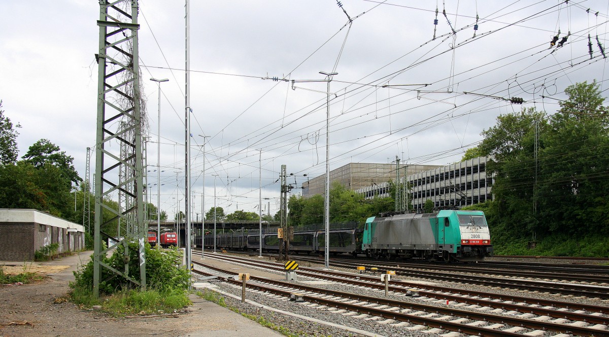 Die Cobra 2808 kommt aus Richtung Montzen/Belgien mit einem langen Citroen-Autoleerzug aus Zeebrugge-Ramskapelle(B) nach Gelsenkirchen-Bismarck(D) und fährt in Aachen-West ein bei Sonne und Regenwolken am Nachmittag vom 5.7.2014.
