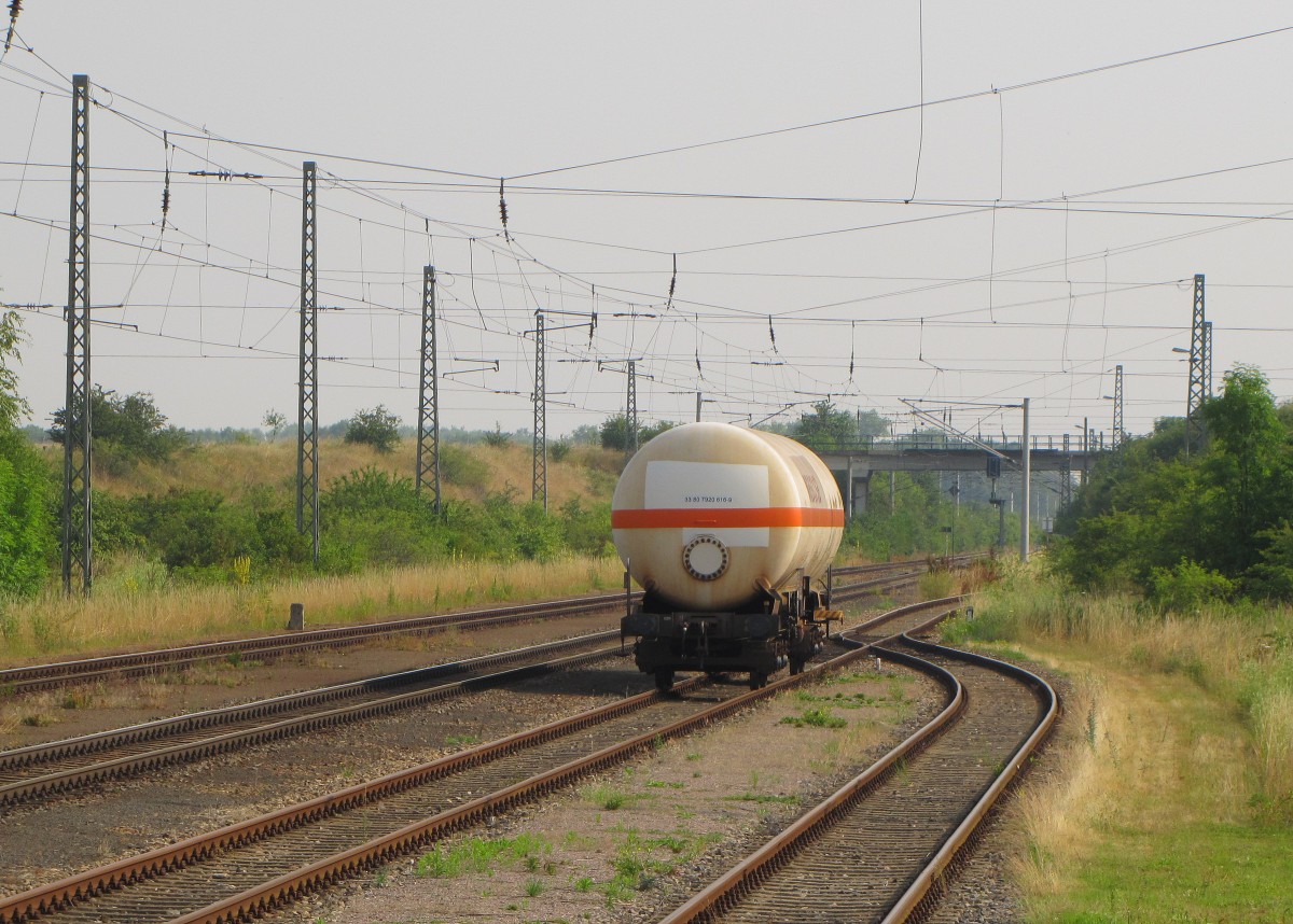 Ein Gaskesselwagen aus dem Anschluss der Firma Lange, am 11.07.2014 auf einem Nebengleis in Großrudestedt.