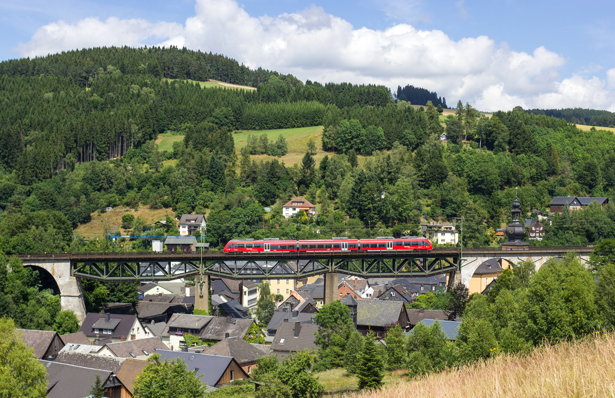 Ein Triebzug der Baureihe 442 als RB nach Bamberg auf der Trogenbachbrücke in Ludwigsstadt (12.07.2014)