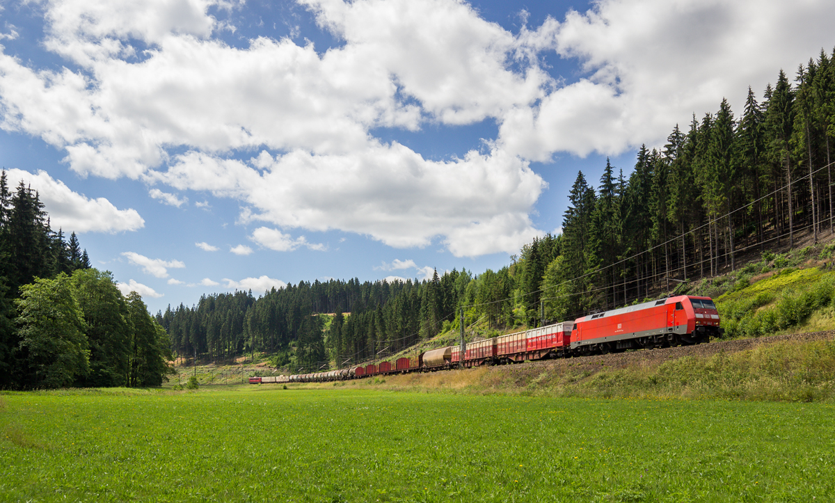 Eine Lok der Baureihe 152 zieht einen kurzen gemischten Güterzug über die Frankenwaldbahn bei Steinbach (12.07.2014)
