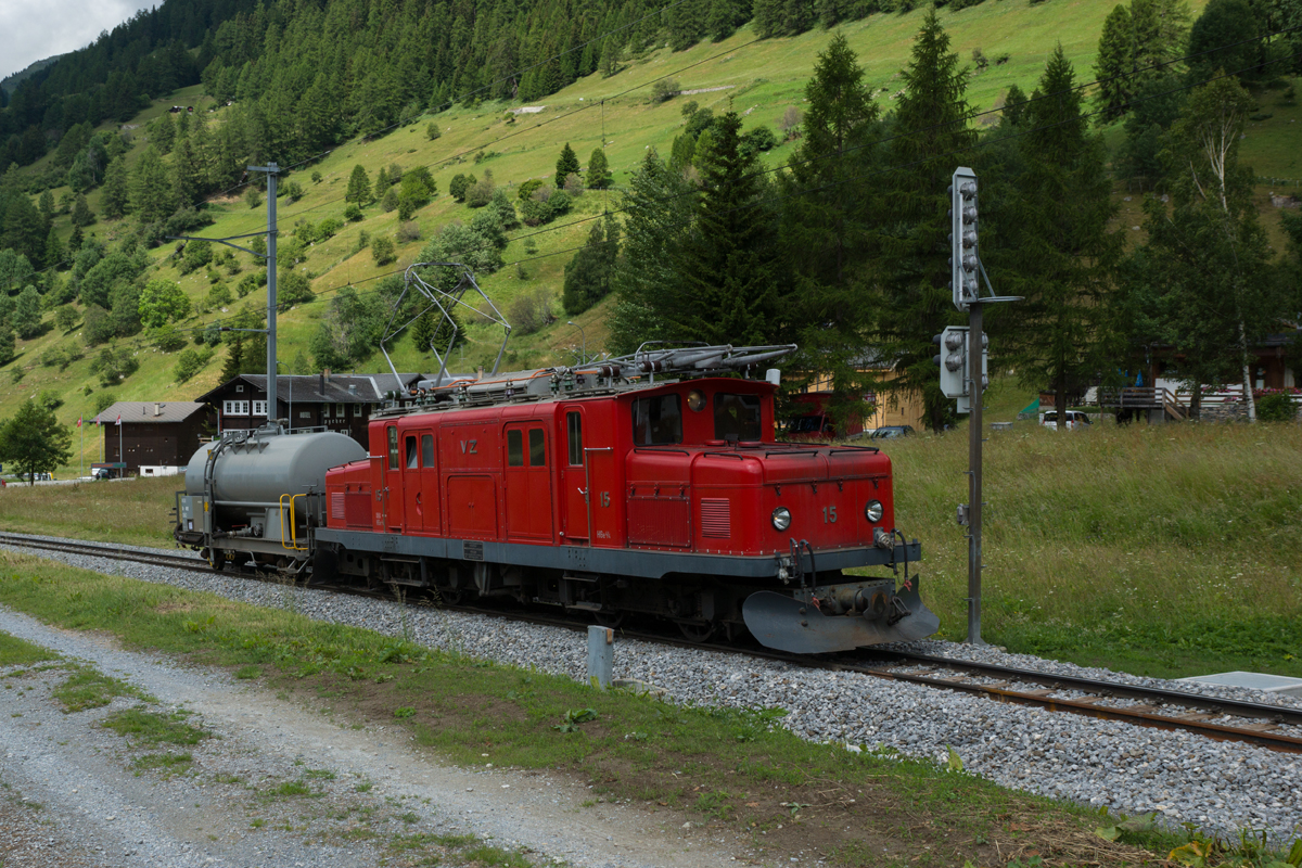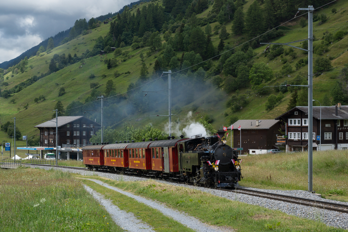 HGe 4/4 15 erreicht wenige Minuten nach dem Dampfzug ebenfalls Reckingen (30.06.2014).