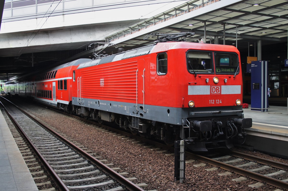 Hier 112 124 mit einem RE5 (RE18506) von Falkenberg/Elster nach Stralsund Hbf., dieser Zug stand am 28.6.2014 in Berlin Südkreuz.