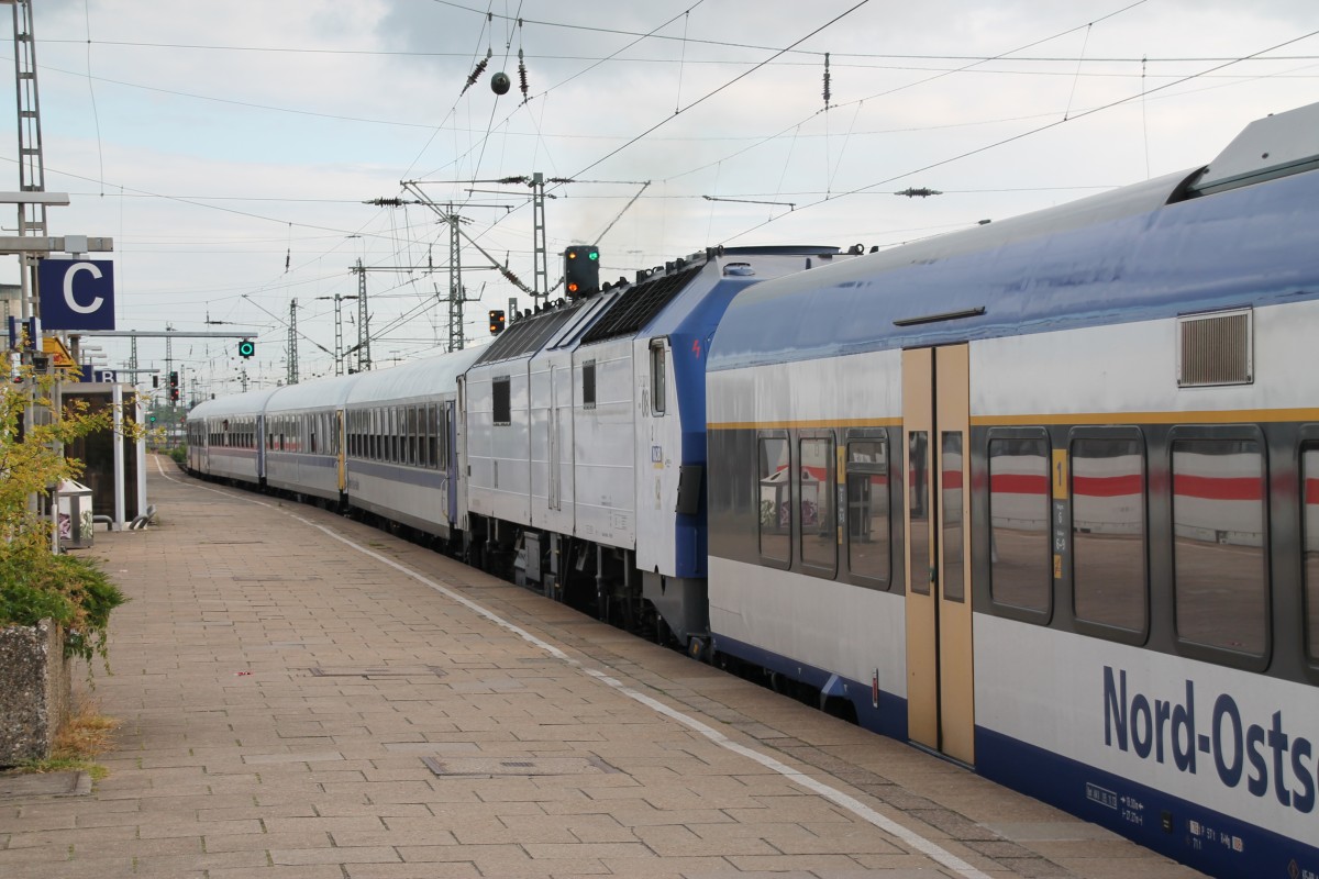120 154-0 mit dem CNL 473 von Kopenhagen nach Basel SBB am Morgen des 24.05.14 beim Verlassen des Hauptbahnhofs von Freiburg im Breisgau.