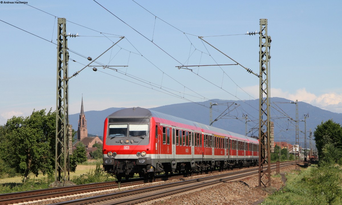Geschoben von einer 143er fährt der RE 1 Mosel-Saar-Express (Saarbrücken - Trier - Koblenz) Steuerwagen voraus entlang der Mosel in Richtung Koblenz, hier am 18.07.2012 bei Kobern-Gondorf.