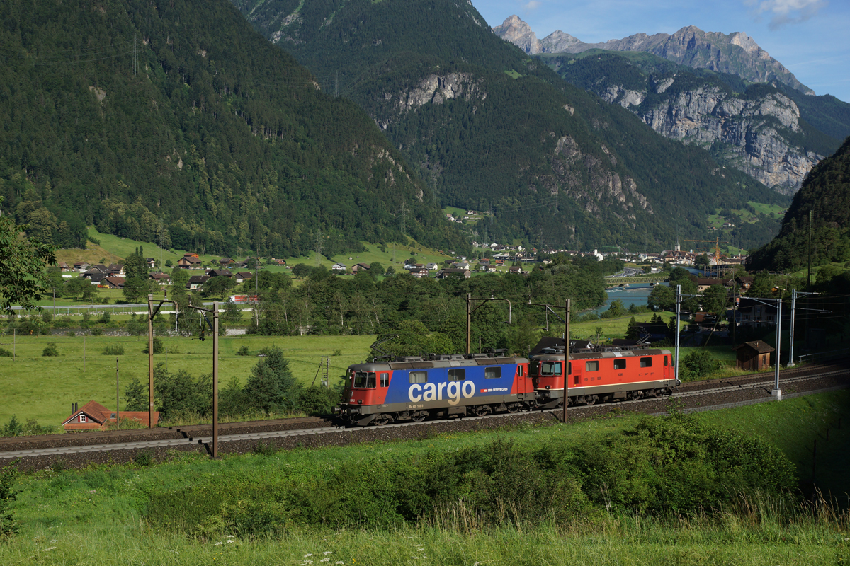 Re 420 169-5 und Re 4/4 II 11306 verlassen am 03.07.2014 Erstfeld als Lokzug in Richtung Göschenen.