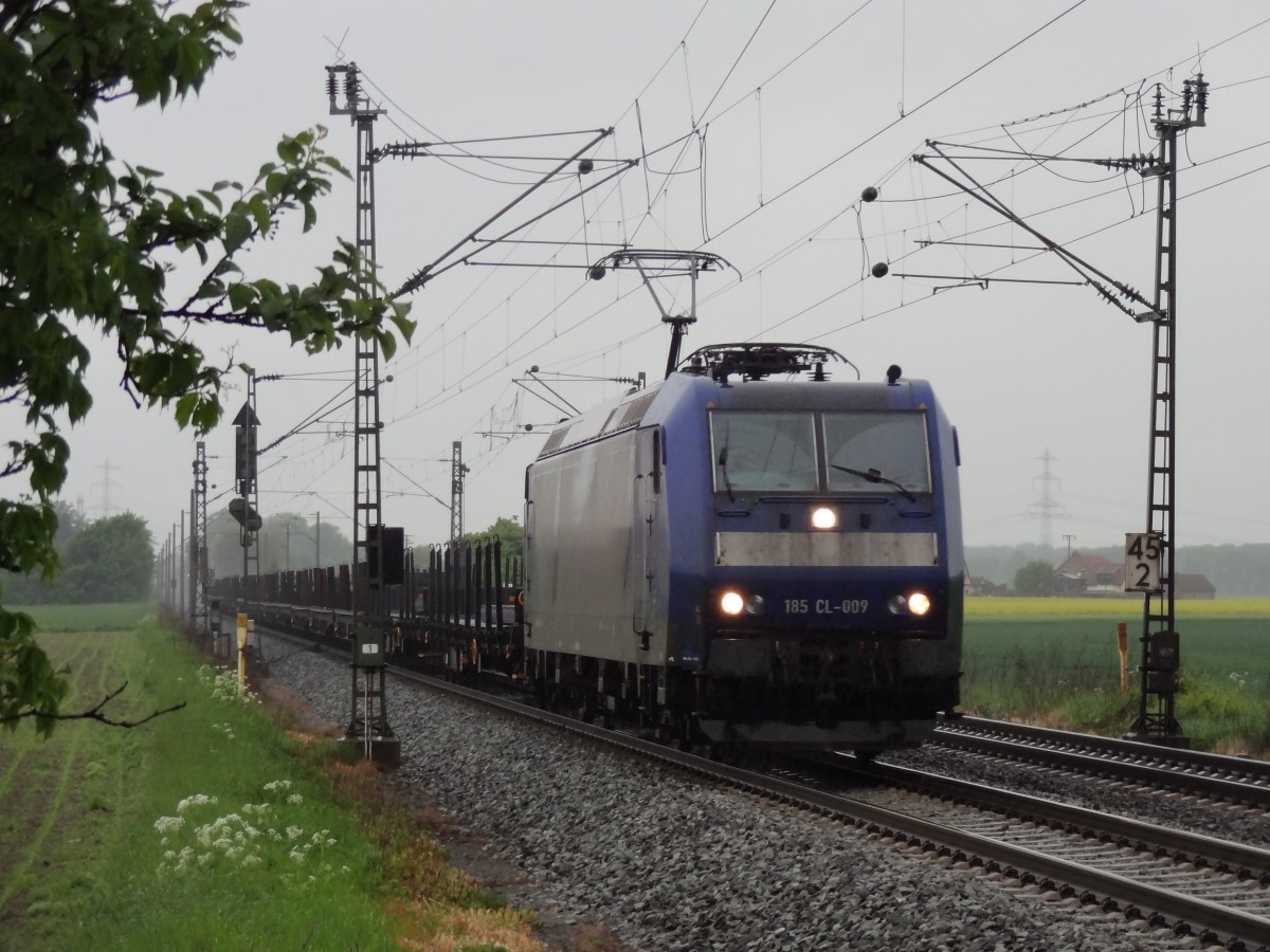 Am 24.5.13 durchfährt 185 CL-009 der Verkehrsbetriebe Peine/Salzgitter Vechelde bei strömendem Regen in Richtung Braunschweig .
