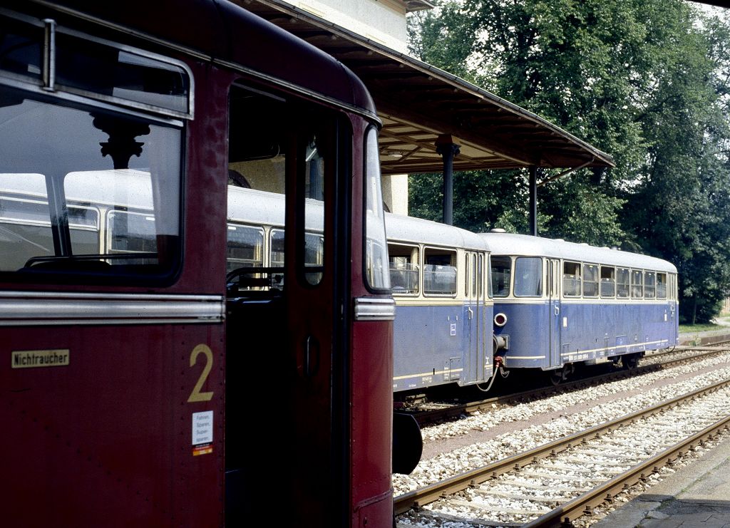 Immer wieder samstags kam es bis Ende der 80-er Jahre in Simbach zum Treffen von DB- und ÖBB-Schienenbussen, wie hier am 22.07.1989.
