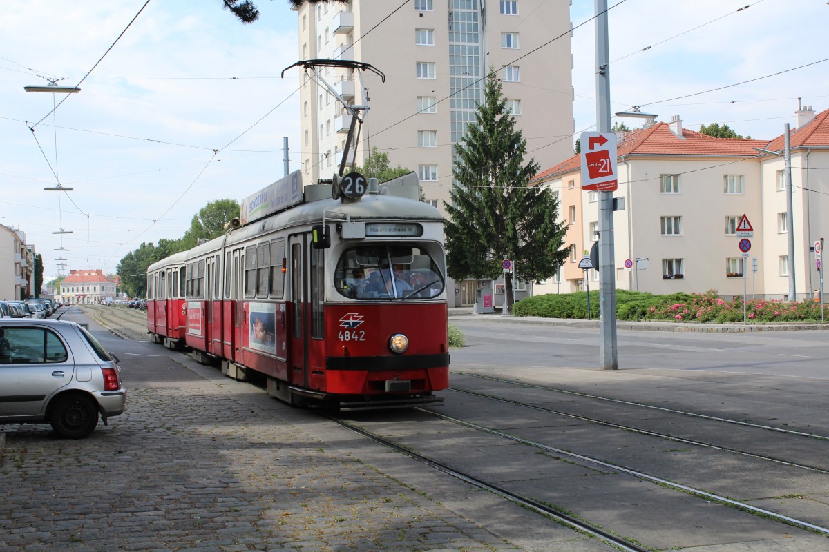 Wien Wiener Linien SL 26 (E1 4842) Strebersdorf, Russbergstrasse / Edmund-Hawranek-Platz am 8. Juli 2014.