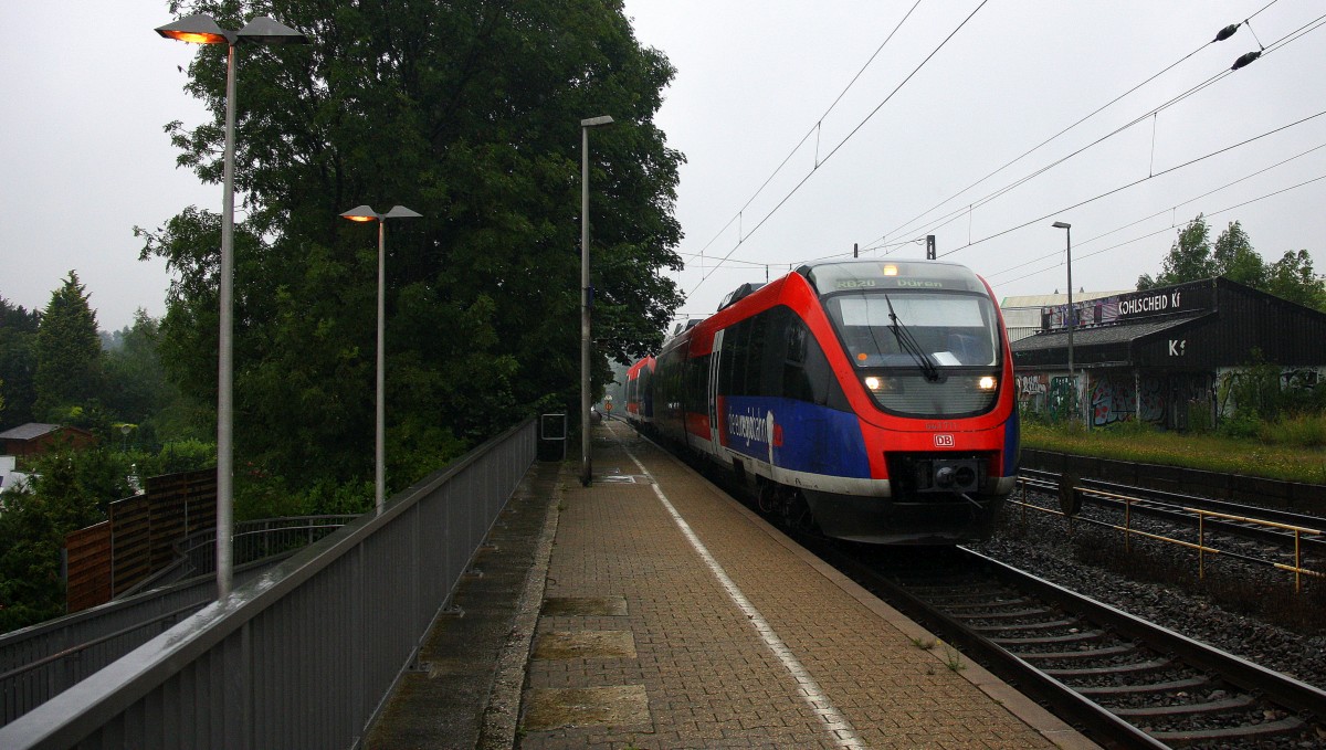 Zwei Euregiobahn (RB20) aus Heerlen(NL)-Stolberg-Altstadt-Düren kommt die Kohlscheider-Rampe hoch aus Richtung Herzogenrath und hält in Kohlscheid und fährt in Richtung Richterich,Laurensberg,Aachen-West.